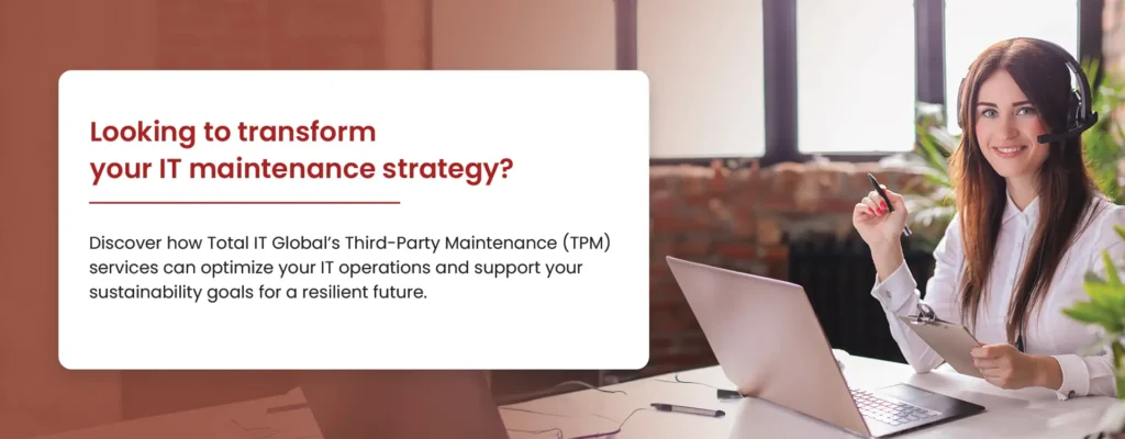 In today’s complex IT landscape, efficient and sustainable maintenance solutions are crucial. Third-Party Maintenance services, like those from Total IT Global, provide a strategic option to take control. TPM can reduce IT maintenance costs by 40% to 70% while extending equipment life beyond OEM end-of-service dates, enhancing sustainability and minimizing waste.