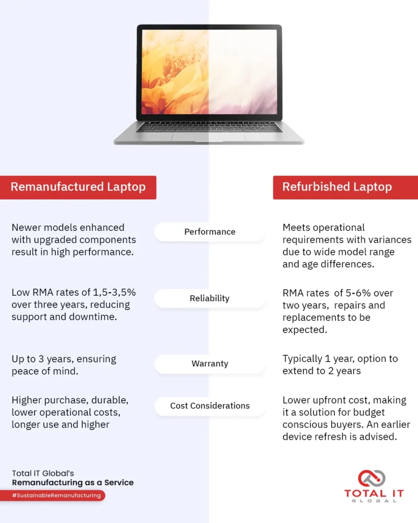Both refurbished and remanufactured laptops support sustainability efforts, but they cater to different business needs. Refurbished laptops provide a cost-effective option with flexibility in upgrades, making them suitable for organisations that can tolerate some variability in quality. However, remanufactured laptops stand out as the superior choice for businesses aiming for long-term sustainability, reliability, and performance.